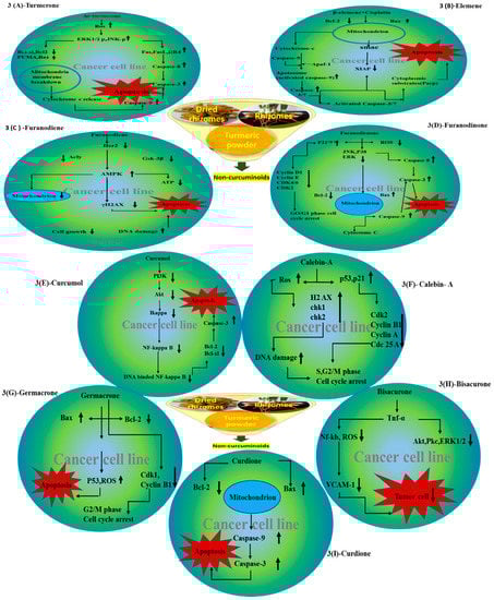 | Turmerone | Unlike curcuminoids, turmerone brought apoptosis due to the distortion caused to the mitochondria in the intrinsic pathway with activation in procaspase-3 cleavage | [33] |