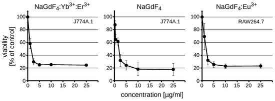 We have shown in our previous studies [] that lanthanide-doped NaGdF4 nanocrystals were toxic to RAW264.7 macrophages and to a lesser extend to NIH3T3 fibroblasts. The present study was complemented by the use of a similar macrophage cell line—J774A.1. The cytotoxicity of NaGdF4 NPs in both cell lines was assessed using the MTS assay, measuring the activity of mitochondrial dehydrogenase and marked as viability of the cell culture. This general parameter conglomerates cell death, proliferation and metabolic activity of the cells. We determined the cytotoxicity of previously used Yb3+,Er3+ co-doped NaGdF4 NPs along with similarly composed NPs doped with europium (Eu3+) ions to exclude the effect of doping element(s) on the tested toxic effect. The observed loss of viability induced by both NaGdF4 NPs was very similar (Figure 2, Table 1). Next, we verified whether the doping itself may influence the toxicity. We found that non-doped NaGdF4 NPs also exhibited similar cytotoxicity (IC50 = 1.13 µg/mL). These results suggest that nanoparticles are toxic regardless of the presence of the dopant and its type. Since the presence of the dopant has negligible effect on cytotoxic properties of NaGdF4 nanoparticles, Yb3+ and Er3+ co-doped NaGdF4 were selected for the current study for practical reasons related to the most suitable photoluminescence properties. Although the selected NPs are highly luminescent, their luminescence does not interfere with standard fluorescent probes used in the study (Figure S6, Supplementary Data).