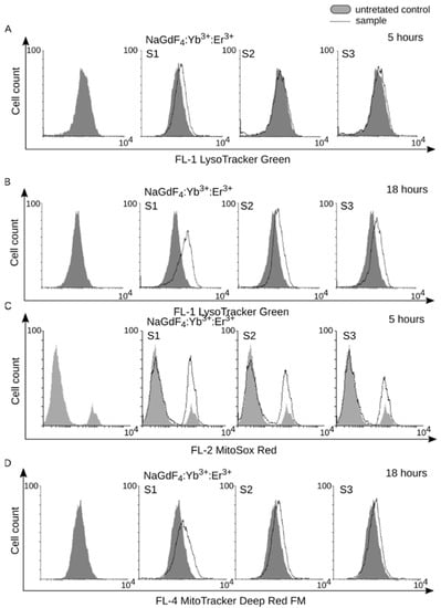 (A,B) Lysotracker analysis of cells treated with NaGdF4:Yb3+,Er3+ NPs (1 µg/mL) after 5 h and 18 h. A shift to the right indicates an increase of cell acidic compartment; (C) Induction of superoxides after a 5-h treatment with NPs detected by staining with the MitoSOX probe; (D) Increase of mitochondrial compartment; staining with the Mitotracker probe after an 18-h treatment with NPs. Representative histograms are shown (n = 3).