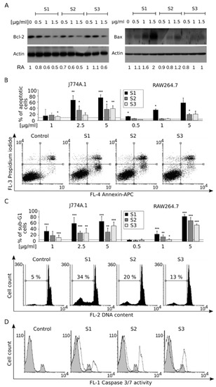 (A) Western blots of pro-apoptotic Bax and antiapoptotic Bcl-2 after a 24-h treatment with NPs (J774A.1). Bax and Bcl-2 protein expressions normalized relative to β-Actin (RA). Representative blots are shown; (B) Dot-plot analysis of Annexin V and propidium iodide staining indicating the apoptotic process. Representative dot-plots are shown. Bar graphs show the analysis of three independent experiments. The averages of apoptotic cells (AnnexinV+/PI− and AnnexinV+/PI+) are shown on the bar graph along with SD; (C) Propidium iodide staining of apoptotic cells. The marked population represents cells with subdiploidal DNA content indicating the final phase of apoptotic process. Representative histograms are shown. Bar graphs show the analysis of 3 independent experiments ± SD. * p < 0.05; ** p < 0.01; *** p < 0.001 All comparisons were performed with respect to the control; (D) Activation of caspases 3 and 7 of the execution phase in J774A.1 cells. Cytofluorometric analysis using a peptide cleaved by activated caspases 3 and 7. Representative histograms are shown (n = 3).