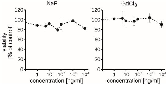 Viability of RAW264.7 cells ± SD after a 48-h treatment with soluble gadolinium and fluoride salts (n = 3).
