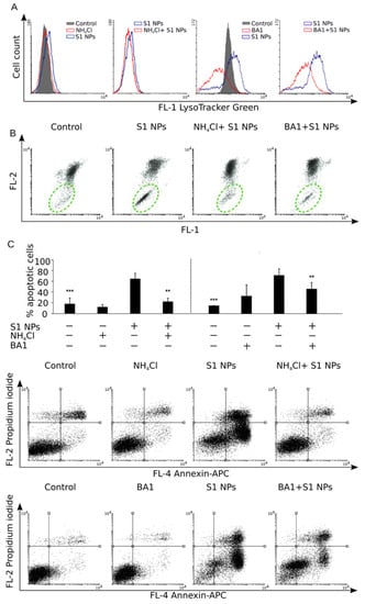 The effect of acidification inhibition of the cells on apoptosis induced by NaGdF4-based nanoparticles (2.5 µg/mL). (A) 50 nM Bafilomycin A1 (BA1) or 5 mM NH4Cl prevents acidification detected by Lysotracker green; (B) dot-plot analysis of the mitochondrial potential (MMP) measured using the JC-1 mitochondrial probe. Representative dot plots are shown; (C) Dot plot analysis of Annexin V and propidium iodide staining indicating the apoptotic process. Representative dot-plots are shown. Bar graphs show the analysis of 3 independent experiments. The average of apoptotic cells are shown (AnnexinV+/PI− and AnnexinV+/PI+) ± SD. * p < 0.05; ** p < 0.01; *** p < 0.001. All comparisons were performed with respect to S1 NPs treated cells.