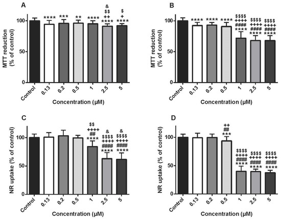 Mitochondrial and lysosomal dysfunction evaluated by the 3-(4,5-dimethylthiazol-2-yl)-2,5-diphenyl tetrazolium bromide (MTT) reduction assay (A,B) and the neutral red (NR) uptake assay (C,D), respectively, in differentiated H9c2 cells incubated with 0.13, 0.2, 0.5, 1, 2.5 and 5 μM of doxorubicin (DOX) for 24 (A,C) and 48 h (B,D). Results are presented as mean ± SD of 6–7 independent experiments (total of 30–42 wells). Statistical analyses were performed using the ANOVA test, followed by the Tukey’s post hoc test (A,B,D) and the Kruskal–Wallis test, followed by the Dunn’s post hoc test (C) (** p < 0.01, *** p < 0.001, **** p < 0.0001 vs. control; ## p < 0.01, #### p < 0.0001 vs. 0.13 µM; + p < 0.05, ++ p < 0.01, ++++ p < 0.0001 vs. 0.2 µM; $ p < 0.05, $$ p < 0.01, $$$$ p < 0.0001 vs. 0.5 µM; & p < 0.05 vs. 1 µM).