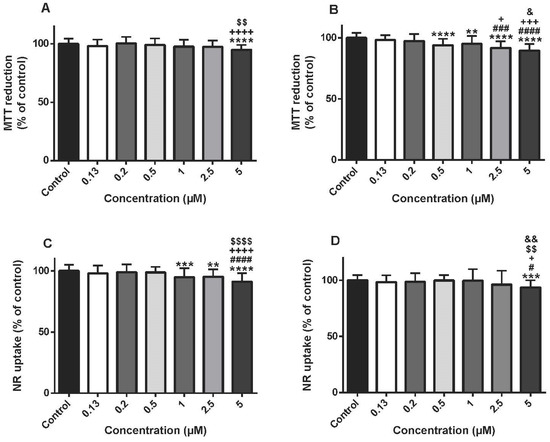 Mitochondrial and lysosomal dysfunction evaluated by the MTT reduction assay (A,B) and the NR uptake assay (C,D), respectively, in differentiated H9c2 cells incubated with 0.13, 0.2, 0.5, 1, 2.5, 5 μM of 5-fluorouracil (5-FU) for 24 (A,C) and 48 h (B,D). Results are presented as mean ± SD of 4–6 independent experiments (total of 27–54 wells). Statistical analyses were performed using the ANOVA test, followed by the Tukey’s post hoc test (A,C,D) and the Kruskal–Wallis test, followed by the Dunn’s post hoc test (B) (** p < 0.01, *** p < 0.001, **** p < 0.0001 vs. control; # p < 0.05, ### p < 0.001, #### p < 0.0001 vs. 0.13 µM; + p < 0.05, +++ p < 0.001, ++++ p < 0.0001 vs. 0.2 µM; $$ p < 0.01, $$$$ p < 0.0001 vs. 0.5 µM; & p < 0.05, && p < 0.01 vs. 1 µM).