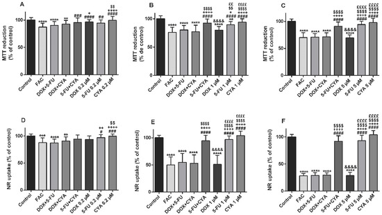 Mitochondrial and lysosomal dysfunction evaluated by the MTT reduction assay (A–C) and the NR uptake assay (D–F), respectively, in differentiated H9c2 cells incubated with 0.2 (A,D), 1 (B,E) or 5 μM (C,F) of 5-Fluorouracil + Adriamycin + Cyclophosphamide (FAC), other mixtures of DOX, 5-FU and CYA and the drugs alone for 48 h. Results are presented as mean ± SD of 4–9 independent experiments (total of 24–42 wells). Statistical analyses were performed using the ANOVA test, followed by the Tukey’s post hoc test (A) and the Kruskal–Wallis test, followed by the Dunn’s post hoc test (B–F) (** p < 0.01, *** p < 0.001, **** p < 0.0001 vs. control; # p < 0.05, ## p < 0.01, ### p < 0.001, #### p < 0.0001 vs. FAC, + p < 0.05, ++ p < 0.01, ++++ p < 0.0001 vs. DOX + 5-FU; $$ p < 0.01, $$$$ p < 0.0001 vs. DOX+ CYA; &&&& p < 0.0001 vs. 5-FU+ CYA, ££ p < 0,01, ££££ p < 0.0001 vs. DOX).