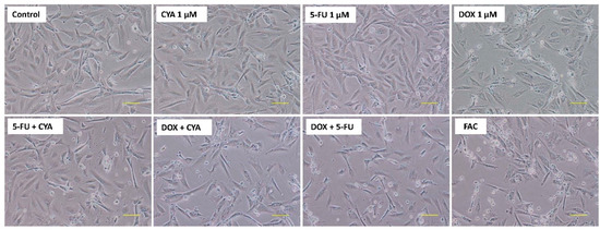 Phase contrast microscopy of differentiated H9c2 cells after 48 h incubation with FAC, other mixtures of DOX (1 μM), 5-FU (50 μM) and CYA (50 μM) and the drugs alone. Images are representative of two independent experiments (scale bar 100 μm).