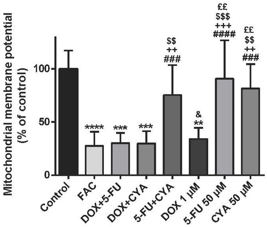 Mitochondrial membrane potential assessed by JC-1 dye in differentiated H9c2 cells incubated with combination of FAC for 48 h. Results are presented as mean ± SD of four independent experiments (total of 12 wells). Statistical analyses were performed using the Kruskal–Wallis test, followed by the Dunn’s post hoc test (** p < 0.01, *** p < 0.001, **** p < 0.0001 vs. control; ### p < 0.001, #### p < 0.0001 vs. FAC; ++ p < 0.01, +++ p < 0.001 vs. DOX + 5-FU; $$ p < 0.01, $$$ p < 0.001 vs. DOX + CYA; & p < 0.05 vs. 5-FU + CYA; ££ p < 0.01 vs. DOX).
