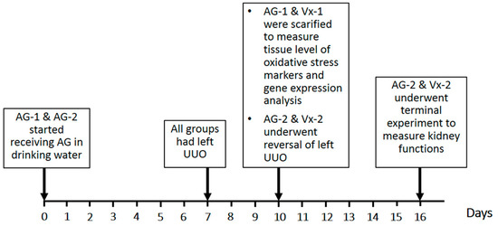 • AG-1 (n = 8) received AG starting 7 days prior to and continuing throughout the period of UUO but was sacrificed at the end of the 3 day period of obstruction to measure the tissue level of oxidative stress markers and gene expression of cytokines.