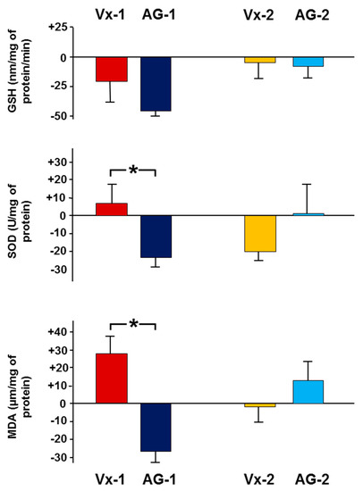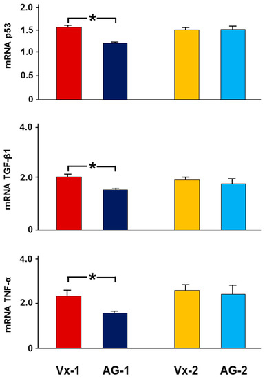 The results were expressed as the mean fold change of gene expression in the left obstructed kidney in the AG-1 and AG-2 compared to Vx-1 and Vx-2, respectively.