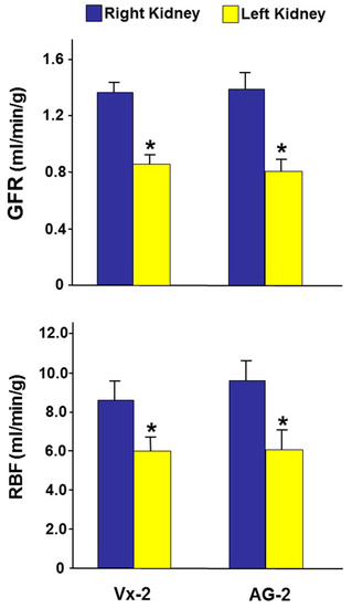 Figure 4. The glomerular filtration rate (GFR) and renal blood flow (RBF) in the right and left kidneys in Vx-2 and AG-2 six days following reversal of left ureteric obstruction. Values represent mean ± SEM. * indicates statistical significance between the right and left kidney within the same group.