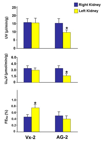 Figure 5. The tubular functional parameters including urine volume (UV), urinary sodium (UNaV), and fractional excretion of sodium (FENa) in both kidneys in Vx-2 and AG-1, six days following reversal of left ureteric obstruction. Values represent mean ± SEM. * indicates statistical significance between the right and left kidney within the same group.