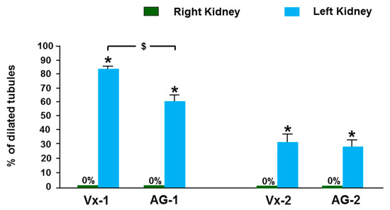 As demonstrated in Figure 6, three days after the creation of the obstruction, the control right kidney in Vx-1 and AG-1 showed normal kidney architecture and histology with 0% dilated tubules (Figure 7). In Vx-1, the left obstructed kidney showed collecting duct dilation in the renal papillae with dilated calices and mild infiltration of renal papillae interstitial tissue with inflammatory cells, mainly lymphocytes. The cortical and superficial medullary tissue showed large areas of tubular dilatation and the degree of tubular dilatation in this group was 82.9 ± 3.3% (Figure 7). In AG-1, the left obstructed kidney showed similar histological features to the left kidney in Vx-1, including the inflammatory cell infiltrate and extracellular matrix, but there was a significantly lower degree of tubular dilatation (59.9 ± 3.57%, p = 0.0003).