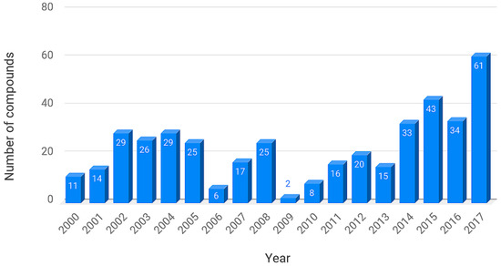 Distribution of compounds reported from 2000 to 2017, as contained in the first version of BIOFACQUIM. Compounds published in 2018 are not shown in this graph.
