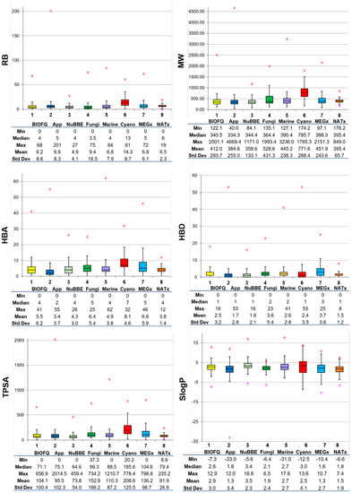 Figure 3 shows box plots of the distribution of the six calculated physicochemical properties (vide supra) calculated for BIOFACQUIM. For comparative purposes, the box plots also include the distribution of the same properties of the seven reference data sets that were retrieved from the literature [15]. The corresponding violin plots are shown in the Supplementary Figure S3. The three main molecular properties, size, flexibility, and molecular polarity, are described by MW, RB, and SlogP, TPSA, HBA, and HBD, respectively. In these plots, the boxes enclose the data points with values within the first and third quartile; the line that divides the box denotes the median of the distributions. The lines above and below indicate the upper and lower adjacent values. The red asterisks indicate the data points with values beyond the upper and lower adjacent values. Summary statistics are presented at the bottom of the box plots. The figure also includes a table below each box plot with the maximum, median, mean, standard deviation and minimum values for each property and each data set.