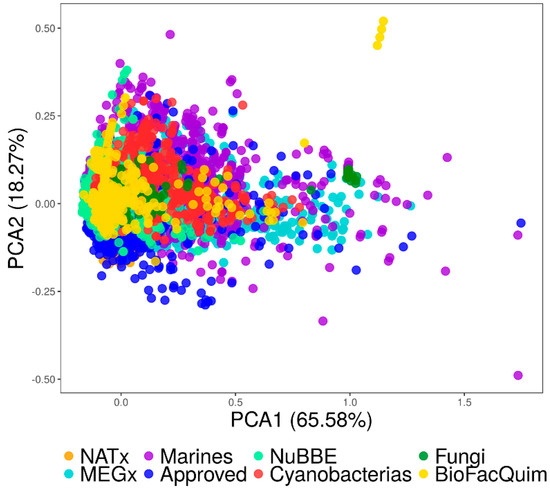 The visual representation of the chemical space in Figure 5 indicates that some of the natural product compounds occupy the same space as the already approved drugs. It also shows that there are molecules in BIOFACQUIM and the Marine set that cover neglected regions of the currently drug-like chemical space. Finally, Figure 5 suggests that BIOFACQUIM shares the chemical space of almost all Fungi and NuBBEDB.