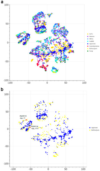 Visual representation of the chemical space of BIOFACQUIM compared with: (a) all reference data sets; and (b) approved drugs. The visualization was generated using t-distributed stochastic neighbor embedding (t-SNE) based on topological fingerprints. The red dots indicate the position of two representative compounds of BIOFACQUIM that are very similar to approved drugs.