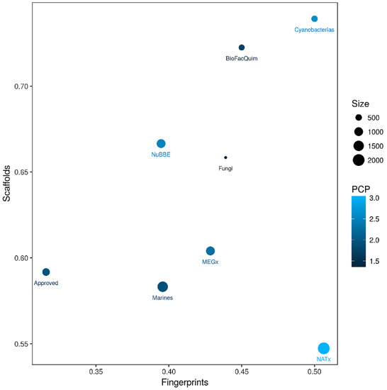 As elaborated in the Materials and Methods section, a CD plot was used to compare the diversity of BIOFACQUIM with the diversity of the reference data sets, based on molecular fingerprints, scaffolds, and whole (physicochemical) properties. Figure 7 shows the CD plot, representing the MACCS keys/Tanimoto similarity on the x-axis. Here, lower values indicate larger fingerprint-based diversity (further details of the fingerprint-based diversity assessment are presented in Figure S1 in the Supplementary Material). The y-axis of the CD plot represents the scaffold diversity where lower values (the area under the scaffold recovery curve—see Table S2 in the Supplementary Material) indicate higher scaffold diversity. The property-based diversity of BIOFACQUIM and each database was calculated as the Euclidean distance of the scaled properties. The values are represented on the color CD plot with data points on a continuous color scale. The darker color represents lower diversity while lighter colors represent higher diversity. Finally, the relative size of the databases is represented with different point sizes, where smaller data points indicate data sets with less number of molecules. The CD plot in Figure 7 shows that BIOFACQUIM and Cyanobacteria are found in the area representing low diversity of both scaffold and fingerprints. This may be attributed to the fact that this is the first version of the database. Regarding the diversity, based on physicochemical properties, the cyanobacteria metabolites were observed to have more diversity (e.g., lighter blue data point in Figure 7) than BIOFACQUIM. This is consistent with the analysis of the box plots discussed in Section 3.2. Figure 7 also indicates that approved drugs have high scaffold and fingerprint diversity that is consistent with previous reports [20,21].