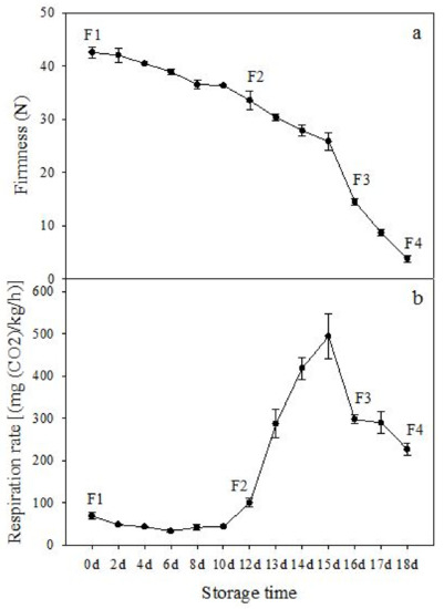 Fruit firmness was determined using a penetrometer (Model GY-3, Zhejiang Scientific Instruments, Zhejiang, China) and expressed as N. Respiration rate was measured according to our previous method and express as mg CO2 kg−1 h−1 [21].