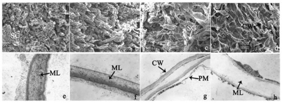The observation on amyloplasts at different stages of banana flesh ripening. (a–d) scanning electron microscopy (SEM) image of F1, F2, F3, and F4, respectively; (e–h) transmission electron microscopy (TEM) image of F1, F2, F3, and F4, respectively. SG: starch grain; CW: cell wall; ML: middle lamella; PM: plasma membrane.