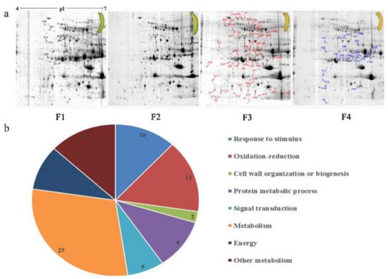Protein spots were separated with isoelectric point (pI) 4–7 and representative gels were shown in Figure 3a. A two-fold threshold was used to judge the changes in abundance as significant for the regulated proteins during banana pulp ripening. Based on these criteria, a total of 94 differentially expressed protein spots were identified by matrix-assisted laser desorption/ionization time-of-flight (MALDI-TOF) MS/MS, and 84 spots were successfully identified on the basis of tryptic peptide sequences according to banana genome. Most of the identified proteins were up-regulated. In detail, compared with F1, 53, 58, and 57 proteins were up-regulated, and 31, 26, and 27 proteins were down-regulated in F2, F3, and F4, respectively. The specific locations of proteins on two-dimensional gel electrophoresis (2-DE) gels are shown in the gels in Figure 3a, and detailed information of each protein is given in Table 1. According to functional categorization of the 84 identified proteins, these differentially expressed proteins were mainly involved in metabolism, oxidation-reduction process, protein metabolic process, energy, and so on (Figure 3b).