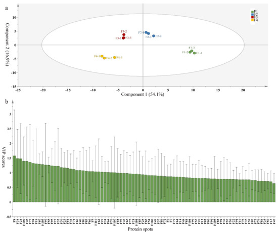To compare differences in proteins from banana fruit at different ripening stages, PLS-DA analysis was carried out. The scores and correlation loadings obtained for the first two latent components of the calculated PLS-DA model were combined in a bi-plot. The first two components of PLS-DA accounted for 71% of the total variance among samples (Figure 4a). As shown in Figure 4a, fruits were separated completely along component 1 and component 2. Additionally, we also calculated the values of variable importance (VIP) scores for the identified proteins to identify proteins that could explain separation of banana fruit at different ripening stages. The VIP is used to explain the weight of the independent variable in explaining the dependent variable. As reported in our previous research [28], the variable with VIP values exceeding 1.0 are considered to have important roles in the PLS-DA discriminant process. In this study, 33 proteins with VIP exceeding 1 (F8, F34, F24, F100, F45, etc.) were identified, which could explain separation of banana fruit at different ripening stages (Figure 4b).