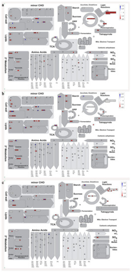 Schematic of the whole metabolism pathway using the MapMan visualization platform. The red or blue squares indicate the up- or down-regulated genes involved in the whole metabolic pathways. (a) F2/F1; (b) F3/F1; (c) F4/F1.