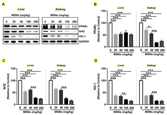 PPARγ can regulate the expression of antioxidant enzymes [29], and suppress inflammation and fibrosis [22,23]. Therefore, we determined the effect of MSNs on PPARγ expression by western blotting. MSNs suppressed the protein expression levels of PPARγ in the liver and kidney of rats (p < 0.001; Figure 4A,B). The 50 mg/kg MSNs down-regulated kidney PPARγ significantly (p < 0.05) when compared with the lower dose. In addition, the 100 mg/kg markedly down-regulated PPARγ expression in the kidney of rats received lower doses.