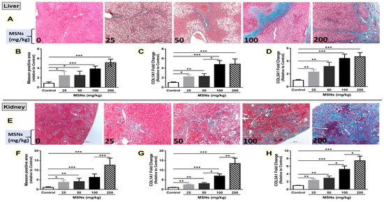 Microscopic examination revealed an increase in the deposition of extracellular matrix (ECM) in the liver (Figure 6A,B) and kidney (Figure 6E,F) of MSNs-induced rats. mRNA expression of collagen I and III was significantly increased in the liver (Figure 6C,D) and kidney (Figure 6G,H) of MSNs-induced rats.