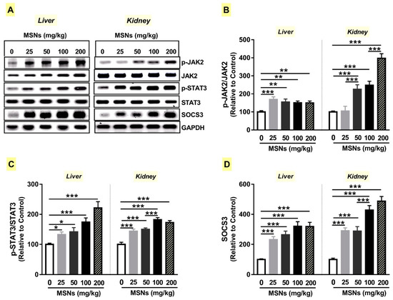 MSNs induced a significant increase in JAK2 and STAT3 phosphorylation and SOCS3 expression (Figure 7A–D) in the liver of rats when administered at doses of 25 (p < 0.001; p < 0.05; p < 0.001), 50 (p < 0.01; p < 0.05; p < 0.001), 100 (p < 0.01; p < 0.001; p < 0.001), and 200 mg/kg (p < 0.01; p < 0.001; p < 0.001).