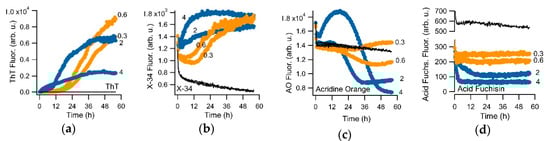 - Hackl, E.V.; Darkwah, J.; Smith, G.; Ermolina, I. Effect of acidic and basic pH on Thioflavin T absorbance and fluorescence. Eur. Biophys. J. 2015, 44, 249–261. [Google Scholar] [CrossRef]
