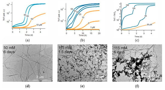 - Meisl, G.; Kirkegaard, J.B.; Arosio, P.; Michaels, T.C.T.; Vendruscolo, M.; Dobson, C.M.; Linse, S.; Knowles, T.P.J. Molecular mechanisms of protein aggregation from global fitting of kinetic models. Nat. Protoc. 2016, 11, 252–272. [Google Scholar] [CrossRef]