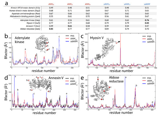 In the second group of protein structures, we found notable differences between predictions by the new model variants and traditional ANMs. The results for a selected set of structures are shown in the table in Figure 1a. For those proteins, the highest correlation coefficient for agreement between model and experiment was at least , or the difference between poorest and best correlation was larger than .
