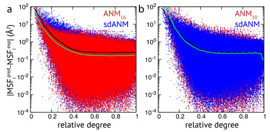 Extensive analysis of predictions by ENM variants. The error in MSF prediction for a set of more than 2000 protein structures is shown. Each data point represents the deviation of predicted and experimental MSF obtained for a single residue bead in a protein elastic network, as a function of its relative degree. (a) Red dots are obtained for ANM and blue dots correspond to sdANM predictions. (b) ANM is compared with sANM. In both plots, the average errors are indicated as black lines for sANMs and as green lines for ANMs.
