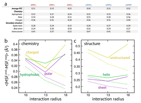 Analysis of predictions by ENM variants for the NMR structural data set. (a) The correlation coefficient averaged over all considered proteins is shown for all models (top row). The averaged absolute deviation in MSF predictions for residue beads from groups with different chemical specificity (hydrophobic, polar, and charged) is shown for all models. Also shown is the averaged absolute error for residue beads categorized into different secondary structural elements. In (b,c), corresponding graphs are shown. Solid lines correspond to sANM data, where values for sdANM are displayed at interaction radius abscissa position 16 Å. Dashed lines are used for ANM data.