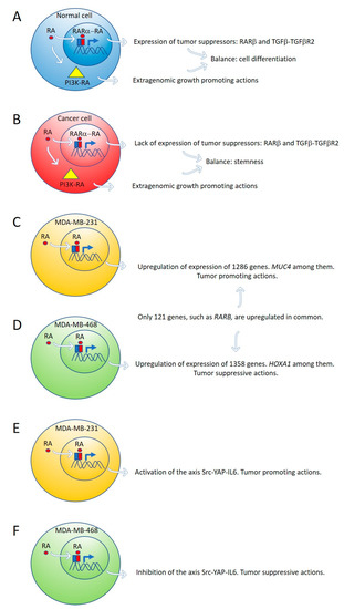 Expression of tumor suppressor genes by retinoic acid (RA) in healthy cells counteracts the growth-promoting activity of nontranscriptional RA signaling pathways, such as PI3K-AKT (A). In cancer cells, lack of expression of tumor suppressor genes by RA cannot counteract the extragenomic tumor-promoting actions of RA (B). Differential gene expression induced by ALDH1A3 or RA in MDA-MB-231 and MDA-MB-468 cells (C,D). Retinoic acid upregulates the signaling pathway Src-YAP-IL6 involved in stemness in triple-negative MDA-MB-231 breast cancer cells (E) and downregulates the same pathway in triple-negative MDA-MB-468 breast cancer cells (F).