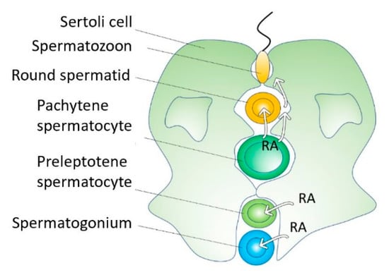 - Endo, T.; Romer, K.A.; Anderson, E.L.; Baltus, A.E.; De Rooij, D.G.; Page, D.C. Periodic retinoic acid–STRA8 signaling intersects with periodic germ-cell competencies to regulate spermatogenesis. Proc. Natl. Acad. Sci. USA 2015, 112, E2347–E2356. [Google Scholar] [CrossRef]