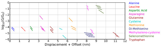 A clustering analysis (Section 2 and Supplementary Materials) was employed to enhance the visibility of the different plateaus. We first discuss the results obtained with the MCBJ technique. When using five classes, the average plateau positions are displayed in Figure 4; clear differences among the behavior of the different molecules were seen. For leucine, only one class was found, while for the other molecules, up to four different classes could be distinguished. Most of the plateaus were between 10‒4 and 10‒5 G0 and were found at an average displacement of about 0.5 nm. For alanine and aspartic acid, two groups were found at similar conductance values, which were at least one order of magnitude lower than those obtained with the STM-BJ technique [10,11], albeit without clustering the data. The high conduction around 0.1 G0 was through selenomethionine and methylselenocysteine which share a seleno-ether group. The reason for this high conduction is not understood.