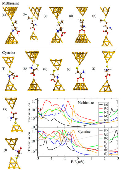The majority of the amino acids studied in this work possess more than two groups available for binding to the gold electrodes within their structure. This is likely to give rise to various conductance plateaus during stretching of the junction, consistent with the experimental observations. As an example, we showed here several possible binding configurations for methionine (Figure 6a–e) and cysteine (Figure 6f–l), together with the corresponding transmission curves. These structures show possible binding scenarios which originate from the presence of three different anchor groups (thiol, carboxyl, and amino) and their possible coordination. Note, that the type of binding formed for cysteine in Figure 6k–l was not considered for methionine since the –SMe group is known to favor binding to undercoordinated gold atoms [30,31]. For the cases in which the molecule was bound to gold via the –COOH group (as in Figure 6b–e,g–k), the hydrogen was removed according to previous literature [32,33,34,35,36,37]. However, since it has also been claimed that the occurrence of the H desorption depends upon the pH condition [38], we further considered the case in which the H ion was preserved: in this case, a shift to lower energy was observed (see Figure S9 of the Supplementary Materials). It is also worth noting that these geometries represent a limited set from the many possible ones. Others are indeed plausible corresponding to different elongation stages of the junction and which are not considered here for computational reasons.