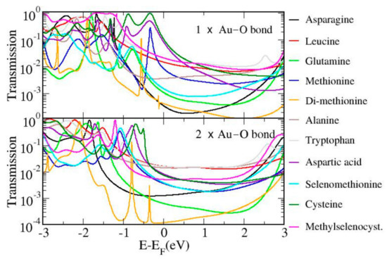 We now turn to the comparison of the transmission curves of the two sets in detail. For most amino acids, the resonance corresponding to the HOMO lies at lower energy in the 2 × O–Au bond geometry than in the 1 × O–Au bond geometry. The amino acids connected to gold at one end via –S (cysteine, methionine), Se (selenomethionine, methylselenomethionine) and –O (aspartic acid) appear to yield resonances closer to the Fermi level as compared to the amino acids connected to gold via –N (tryptophan, alanine, asparagine, glutamine, and leucine). An exception to this trend is di-methionine, which is connected via –N and the HOMO of which lines up not far from the Fermi level; however, the different behavior is not surprising given the quite different structure as compared to the other amino acids. In fact, this molecule shows very narrow peaks and generally lower conductance than the others in both geometries. It is worth mentioning that, for this molecule, the two geometries considered in Figure 7 did not correspond to the junction of maximum length. The latter was actually obtained by binding through the S atoms at both ends which yielded much lower conductance (see Figure S11 in the Supplementary Materials).