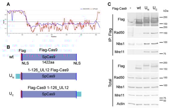 To test whether the chimeric constructs interact with the endogenous MRN complex (Mre11, Rad50, and Nbs1), we transfected HEK293 cells with the Cas9 plasmids encoding a non-specific guide RNA that is not expected to induce cleavage of the DNA. This was to insure that any interaction was through the Cas9 constructs and not mediated by cleaved DNA. The endogenous MRN complex co-immunoprecipitated with the UN and UC constructs but not with the wt (wild-type) Cas9, as seen in Figure 1C. This demonstrated that the UL12 aa1-126 disordered fragment, when fused to Cas9 at either the N- or C-terminus, promoted efficient association with MRN.