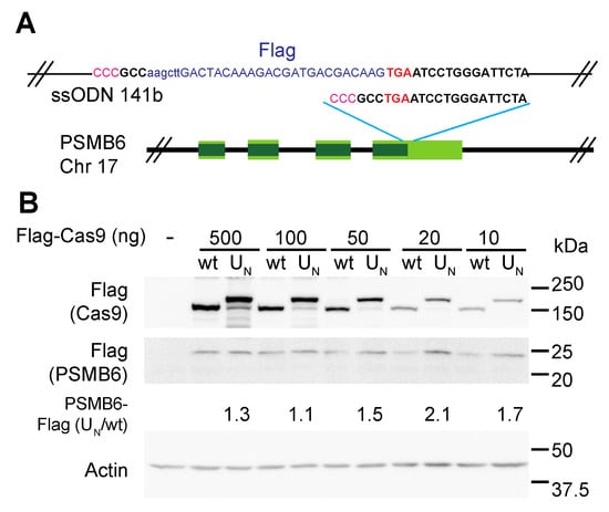 We first tested the MRN recruitment strategy in making a small insertion at a precise location into an endogenous gene. To this end, we used CRISPR editing of HEK293 cells to add a Flag tag to the C-terminus of proteasome subunit β1, encoded by the PSMB6 gene, as seen in Figure 2A. HEK293 cells were transfected with the Cas9/sgRNA plasmids and ssODN, and the pool of transfected cells was harvested for analysis by SDS-PAGE and immunoblotting. We quantified the PSMB6-Flag level in the transfected cells as a measurement of editing success. Success in generating the chimeric PSMB6-Flag with wt Cas9 was dose-dependent and a maximal level was obtained with the highest Cas9 levels. In contrast, we obtained maximal PSMB6-Flag level with 20 ng of the UN Cas9 plasmid, which is about five times lower than the amount of naïve Cas9 plasmid needed for maximal editing, as seen in Figure 2B. Furthermore, the maximal level obtained under MRN recruitment, using UN Cas9, was higher than that obtained with the maximal level of wt Cas9, indicating that high levels of editing were achieved with very low levels of the chimeric Cas9. These data suggest that recruitment of the MRN complex dramatically potentiates HDR-dependent targeted editing.
