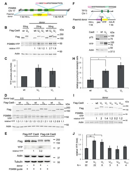 The following are available online at https://www.mdpi.com/2218-273X/9/10/584/s1, Figure S1: Purified Recombinant Cas9 proteins, Figure S2: PSMB6-YFP in CRISPR-edited cells is incorporated into active proteasomes, Figure S3: Editing of PSMB6-YFP is improved with MRN-recruiting constructs, Figure S4: Puromycin-selected pools of edited cells express YFP-p73, Figure S5: UL12 1-50aa fragment has NLS, Figure S6: Complete 126 aa domain of UL12 is needed for recruitment of MRN, Figure S7: Editing of HEK293 to produce TAF1 G716D ts cells, Figure S8: MRN-recruiting constructs of Cas9 show more efficient editing of point mutation - expression levels of Cas9 constructs, Table S1: Oligonucleotides used in this study.