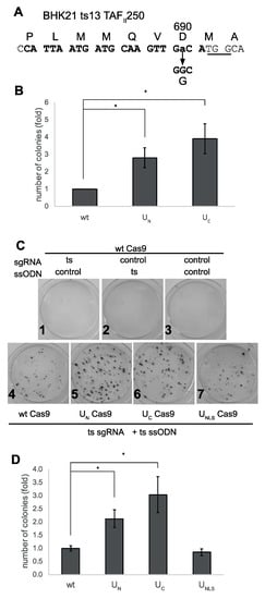 Next, we looked for a model of a genetic disease that is caused by a single amino acid change. To this end, we looked for a temperature-sensitive (ts) cell line, and used CRISPR editing to revert the ts mutation to the wild type sequence. We used BHK21/13 ts13, with a well-defined point mutation, G690D, in the TAFII-250 (TAF1) gene on the X chromosome, which encodes the largest component of the basal transcription complex TFIID [37]. These cells, a mutant isolate of BHK (baby hamster kidney) cells, grow at permissive temperature (we used 32 °C), but die when incubated for several days at the restrictive temperature of 39.5 °C. As seen in Figure 4A, CRISPR editing of this locus produced colonies of the edited cells that were no longer temperature-sensitive. The chimeric constructs showed an advantage in editing efficiency, with three to four times more editing seen with UN and UC, as seen in Figure 4B.