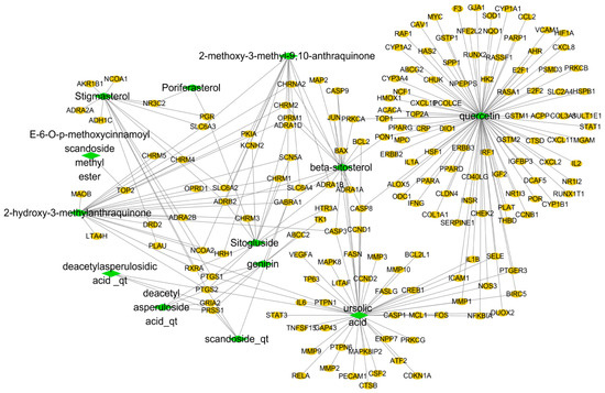 HDW compound–target network. Green represents the HDW compounds and yellow represents the targets of the HDW compounds.