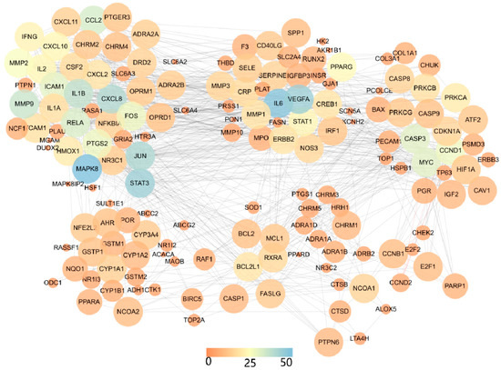 Protein–protein interaction (PPI) network of HDW compound targets. Different colors represent the degree, as the scale indicates. The size of the circle also indicates the degree.