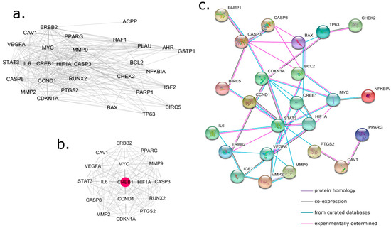 PPI network of HWD compound targets against prostate cancer (PCa). (a) The PPI network constructed using Cytoscape (version 3.7.1); (b) the cluster generated from (a), where the red target represents CREB1, the seed in this cluster; (c) the original PPI data generated from the STRING database showing the detailed interactions of the targets.
