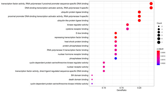 Gene enrichment (GO) analysis for the 30 shared HDW compound targets/PCa-related targets. The color represents the different adjusted p-values (<0.05), while the size of the circle represents the count.