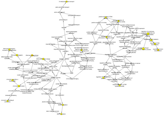 The biological process of HDW. Yellow circles represent the biological processes with adjusted p-values <0.05.