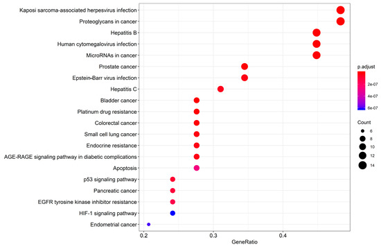 As is shown in Figure 6, we further performed KEGG [46] enrichment analysis on the 30 common targets shared by the HDW compound targets and the PCa-related targets. We obtained 87 pathways in total which belonged to several categories, including human diseases, environmental information, organismal systems, and cellular processes, among others, of which the top 20 significantly enriched KEGG targets are presented (adjusted p-value < 0.05) in Figure 6. In the cancer-related disease, prostate cancer (hsa05215), bladder cancer (hsa05219), colorectal cancer (hsa05210), and small cell lung cancer (hsa05222) data were processed using KEGG enrichment analysis. Detailed KEGG information is shown in Table 4. This result indicated that HDW had the potential to affect a diverse range of cancers, such as prostate cancer, bladder cancer, colorectal cancer, and small cell lung cancer, which was confirmed by other researchers [18,26]. This KEGG enrichment result showed that HDW was highly involved in the regulation of angiogenesis, cell differentiation, migration, apoptosis, invasion, and proliferation [20,23]. Therefore, we speculate that the underlying mechanism of HDW against PCa may be due to its coordinated regulation of several cancer-related pathways [26].