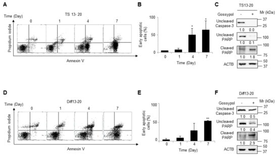 To determine the mechanism of glioblastoma cell death caused by gossypol, we checked whether gossypol treatment induced apoptosis of glioblastoma cells. Gossypol-treated TS13-20 cells showed upregulation of early apoptosis in a time-dependent manner as determined by flow cytometry of annexin V-positive and PI-negative fractions (Figure 2A,B). Gossypol-treated TS13-20 cells showed decreased uncleaved caspase-3 and PARP and increased cleaved PARP, which clearly showed that gossypol induced apoptosis of glioblastoma TS (Figure 2C). Gossypol-treated Diff13-20 cells showed similar phenomena (Figure 2D–F). These results suggest that gossypol induces apoptosis of glioblastoma in both three-dimensional TS cell culture and two-dimensional adherent cell culture.
